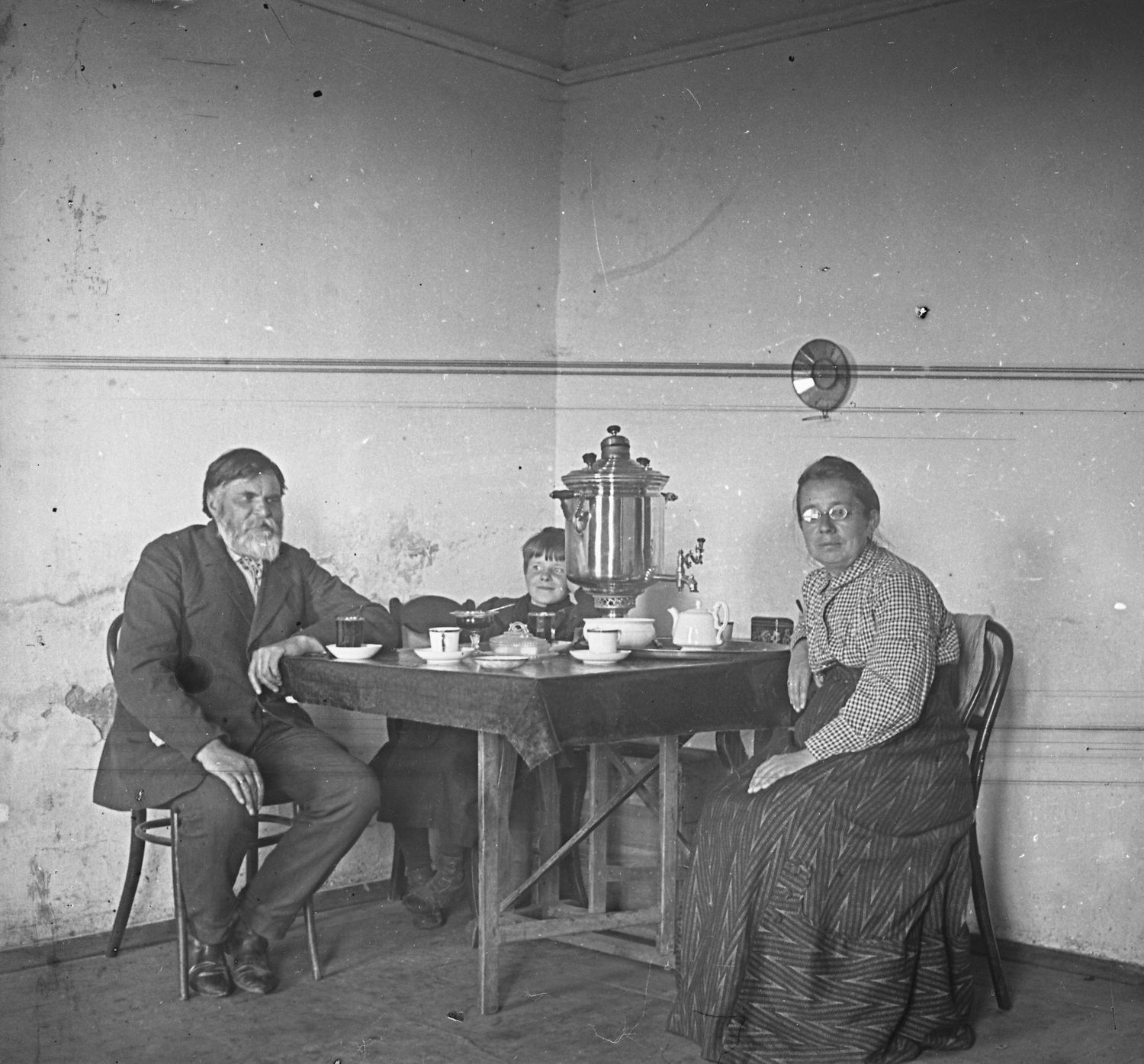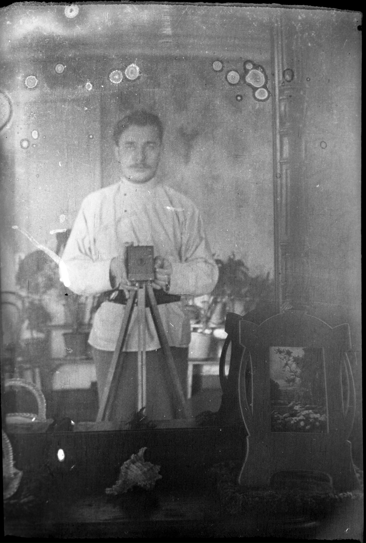 Это изображение знакомит с Петром Оводовым — сыном последнего головы Епифани и создателем того самого фотоархива. Мужчина снял себя через зеркало на фоне камерного зимнего сада. Предположительно, снимки Петр делал на Kodak Brownie № 2.