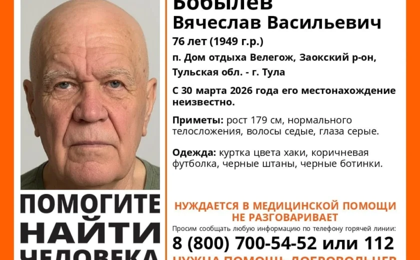 В Тульской области разыскивают 76-летнего Вячеслава Бобылева, который пропал 30 марта 2026 года. Пенсионер проживал в поселке Дом Отдыха Велегож Заокского района.