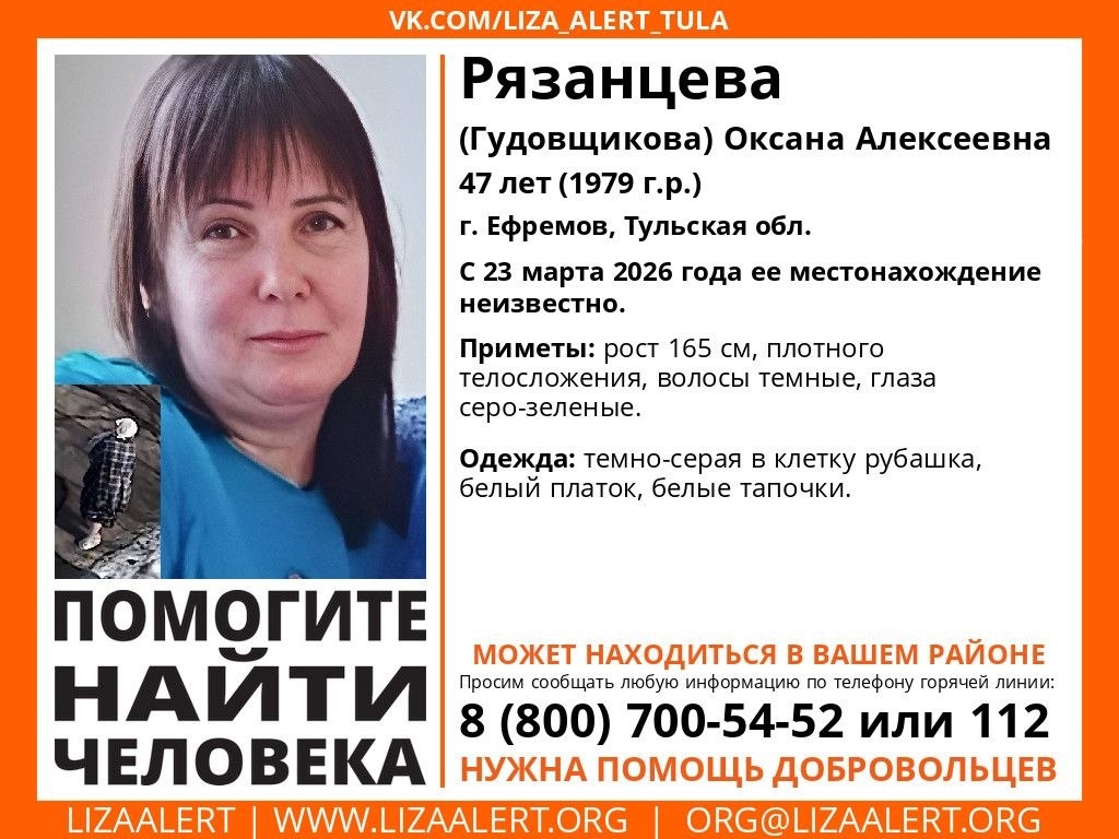 В Тульской области продолжаются поиски 47-летней Оксаны Рязанцевой. Напомним, с 23 марта местонахождение жительницы Ефремова неизвестно.