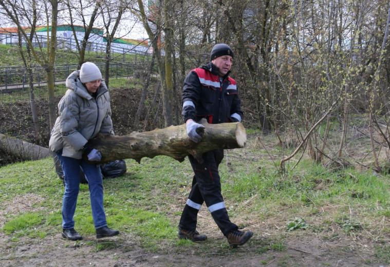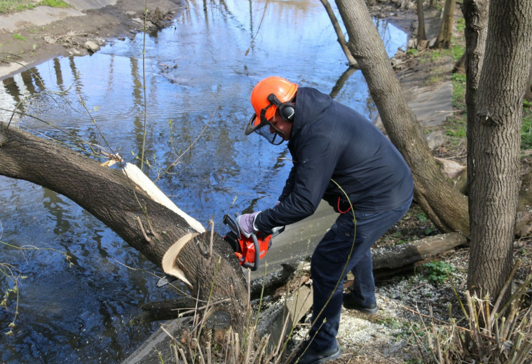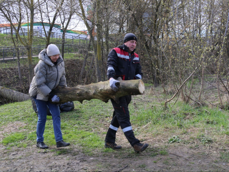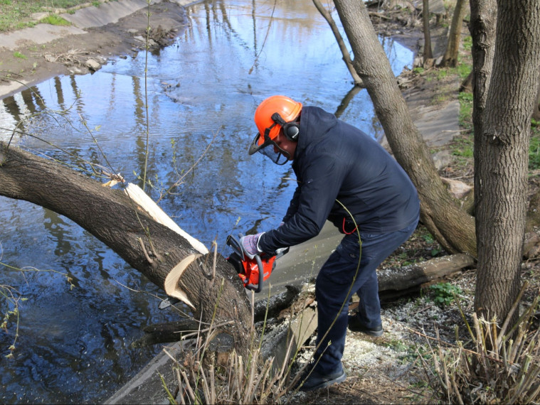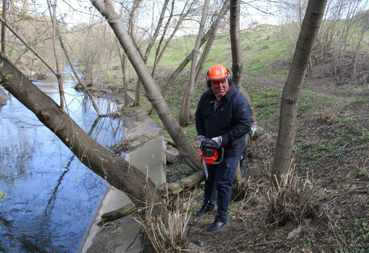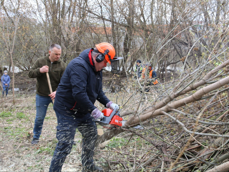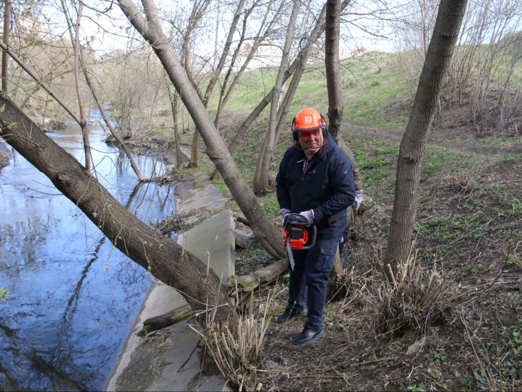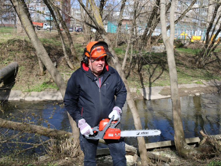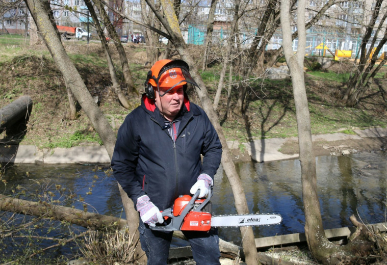 Илья Беспалов убирался на ул. Новомосковской. Здесь приводили в порядок, в том числе русло Рогожинского ручья. Глава городской администрации распиливал аварийные деревья.