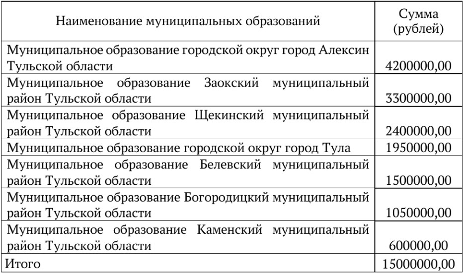 Общая сумма дотаций составляет 15 млн рублей. Больше всего получит Алексин — 4,2 млн рублей. Затем идет Заокский муниципальный район. Ему выделят 3,3 млн рублей дотаций. Тула в списке четвертая — областной центр получит 1,95 млн рублей.