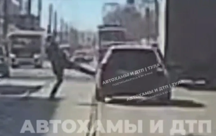 На улицах Тулы заметили агрессивного пешехода, который пнул машину. Свидетели опубликовали видео в канале «Автохамы и ДТП | Тула».
