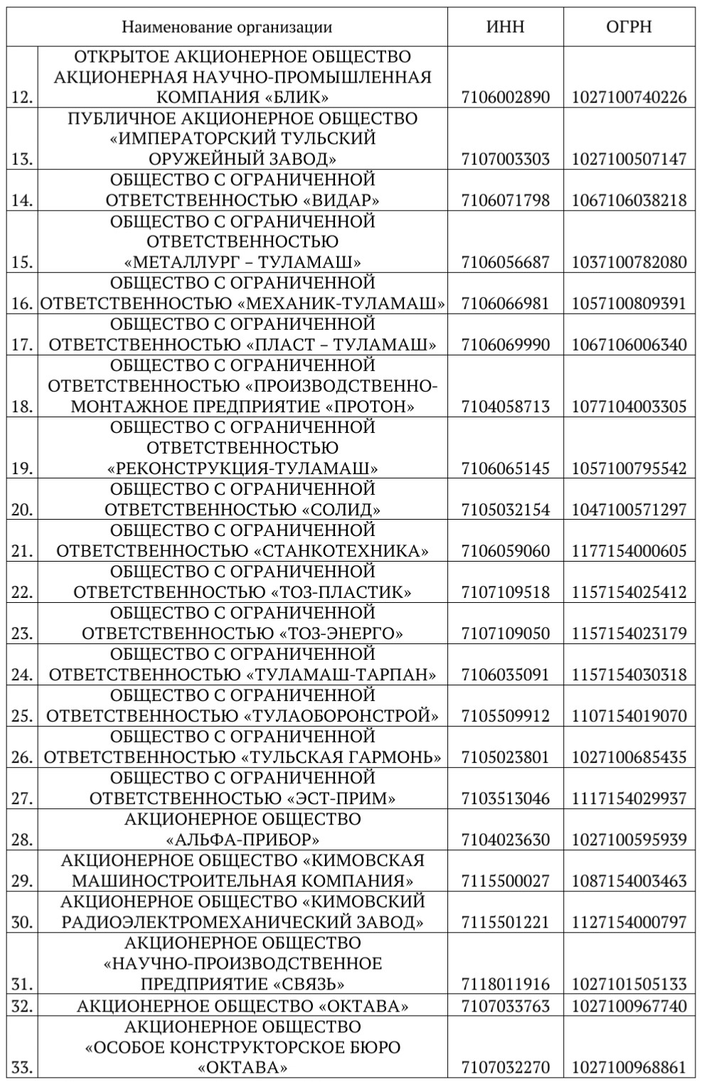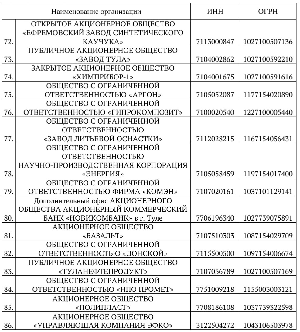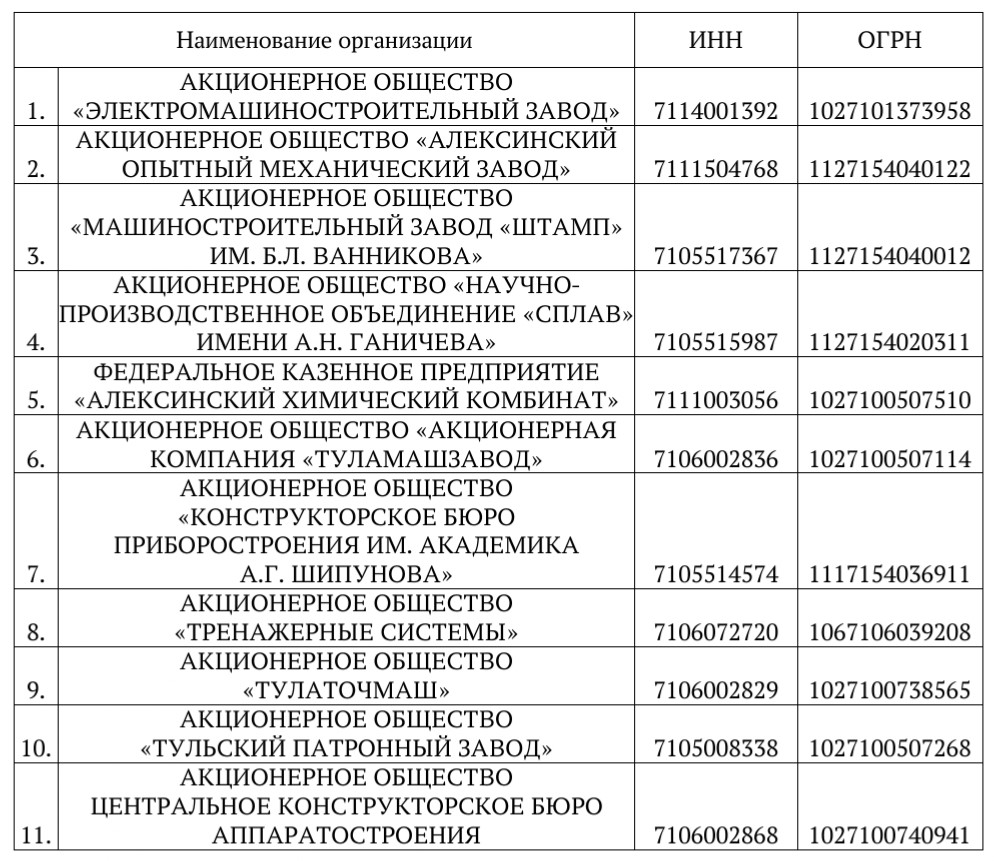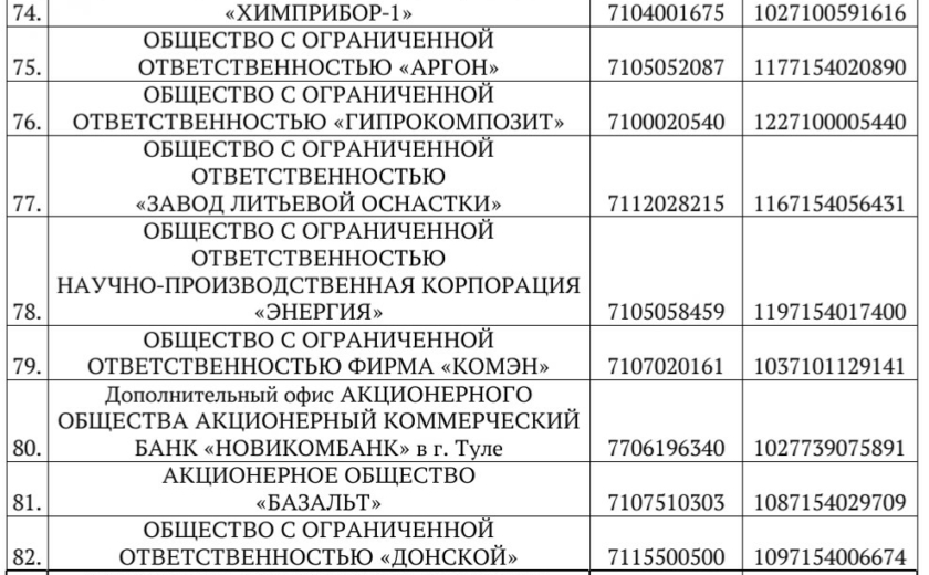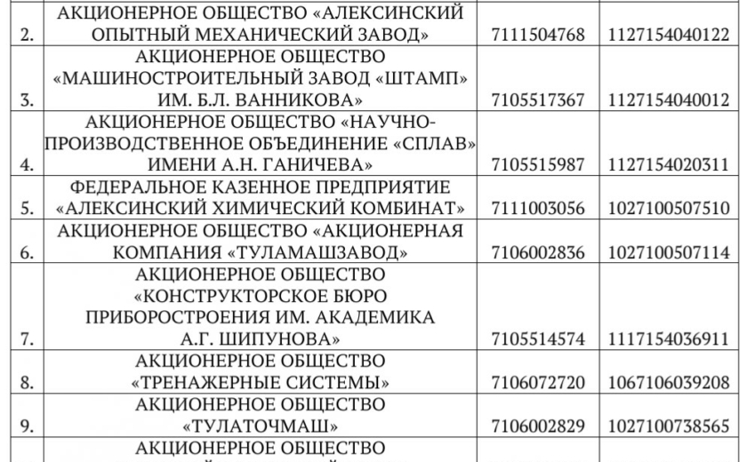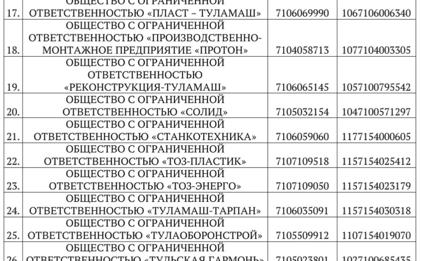 В списке — 86 тульских компаний от оборонных предприятий до обувных фабрик, завода «Тульская гармонь» и банковского филиала. Подробнее — в галерее ниже.
