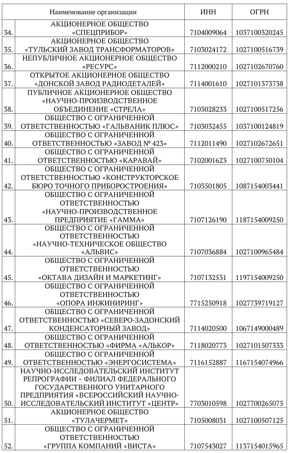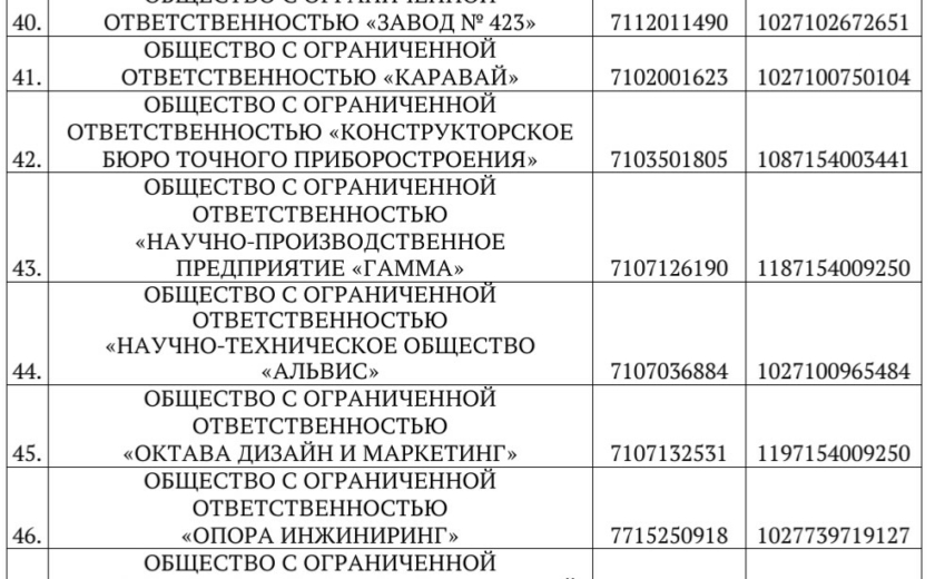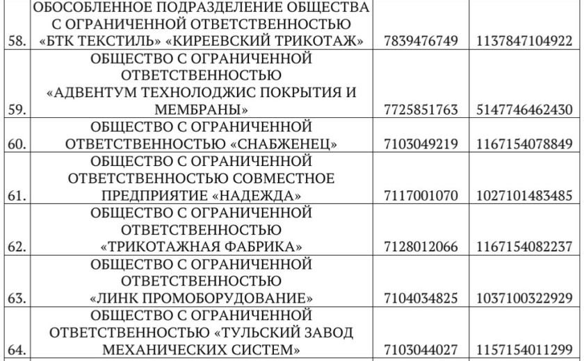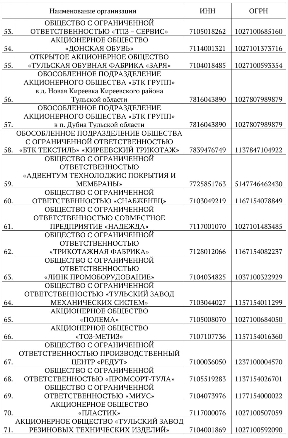 В списке — 86 тульских компаний от оборонных предприятий до обувных фабрик, завода «Тульская гармонь» и банковского филиала. Подробнее — в галерее ниже.