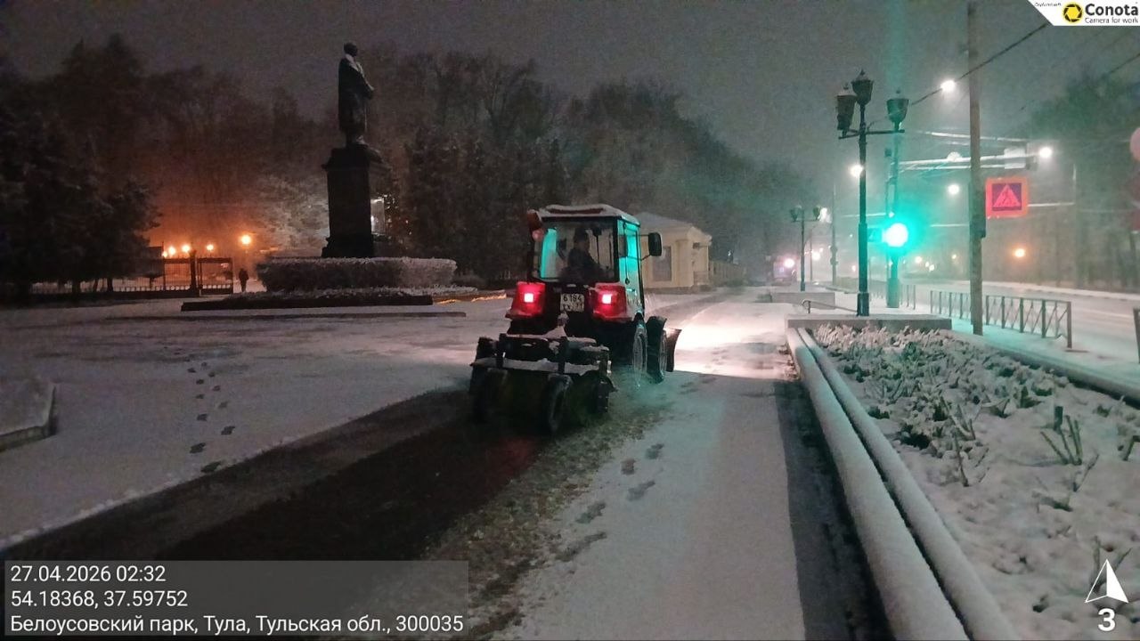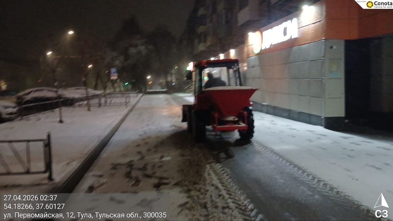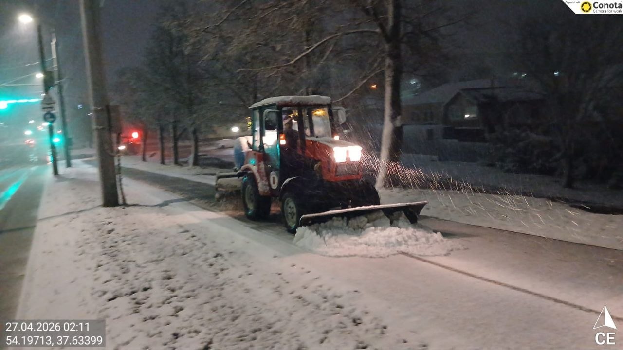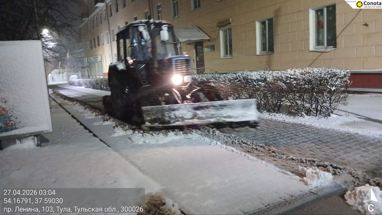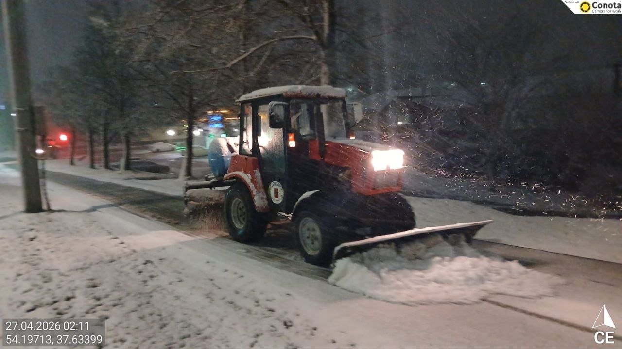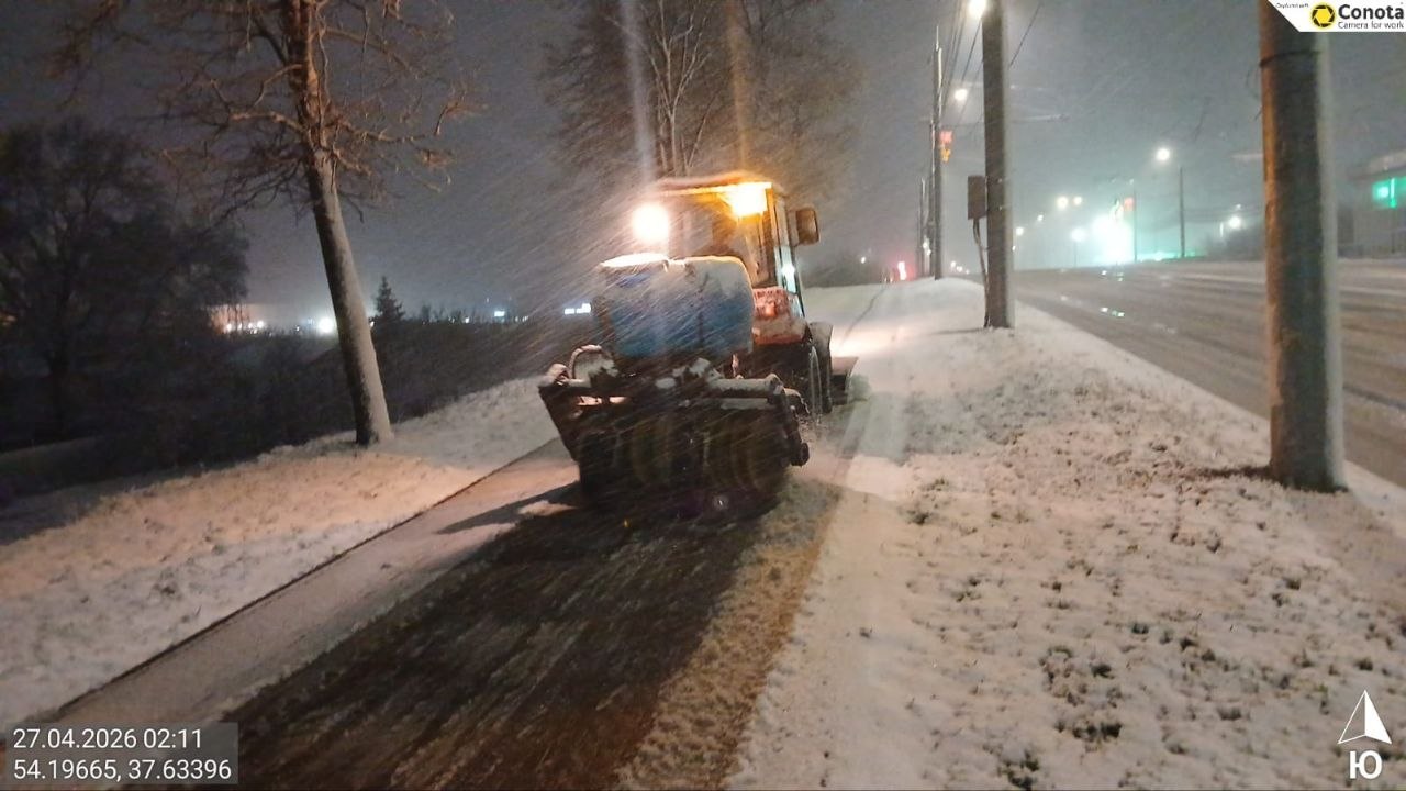Тракторная техника и малая механизация очищали тротуары и пешеходные переходы, подметая их и обрабатывая реагентами.
