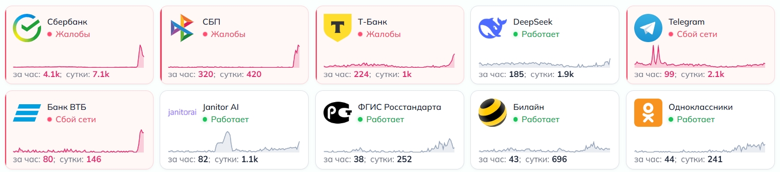 Утром 3 апреля россияне столкнулись с масштабным сбоем в работе трех банков: «Сбера», Т-Банка и ВТБ. По данным сайта Down Detector, в Тульской области число жалоб на работу сервисов остается средним, хотя с каждым часом их количество возрастает.