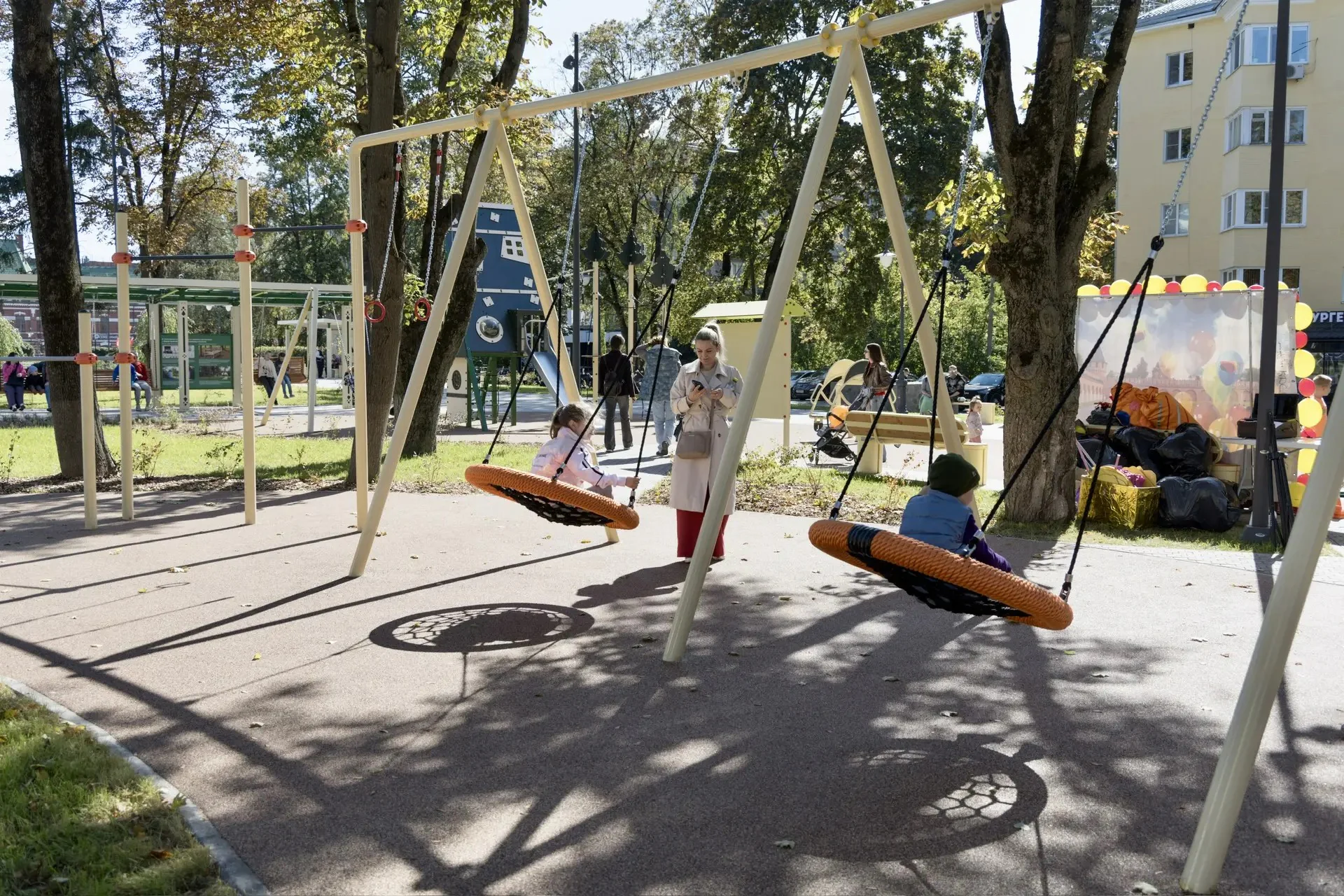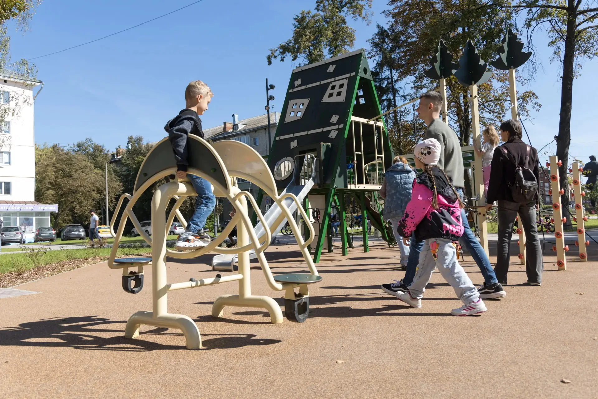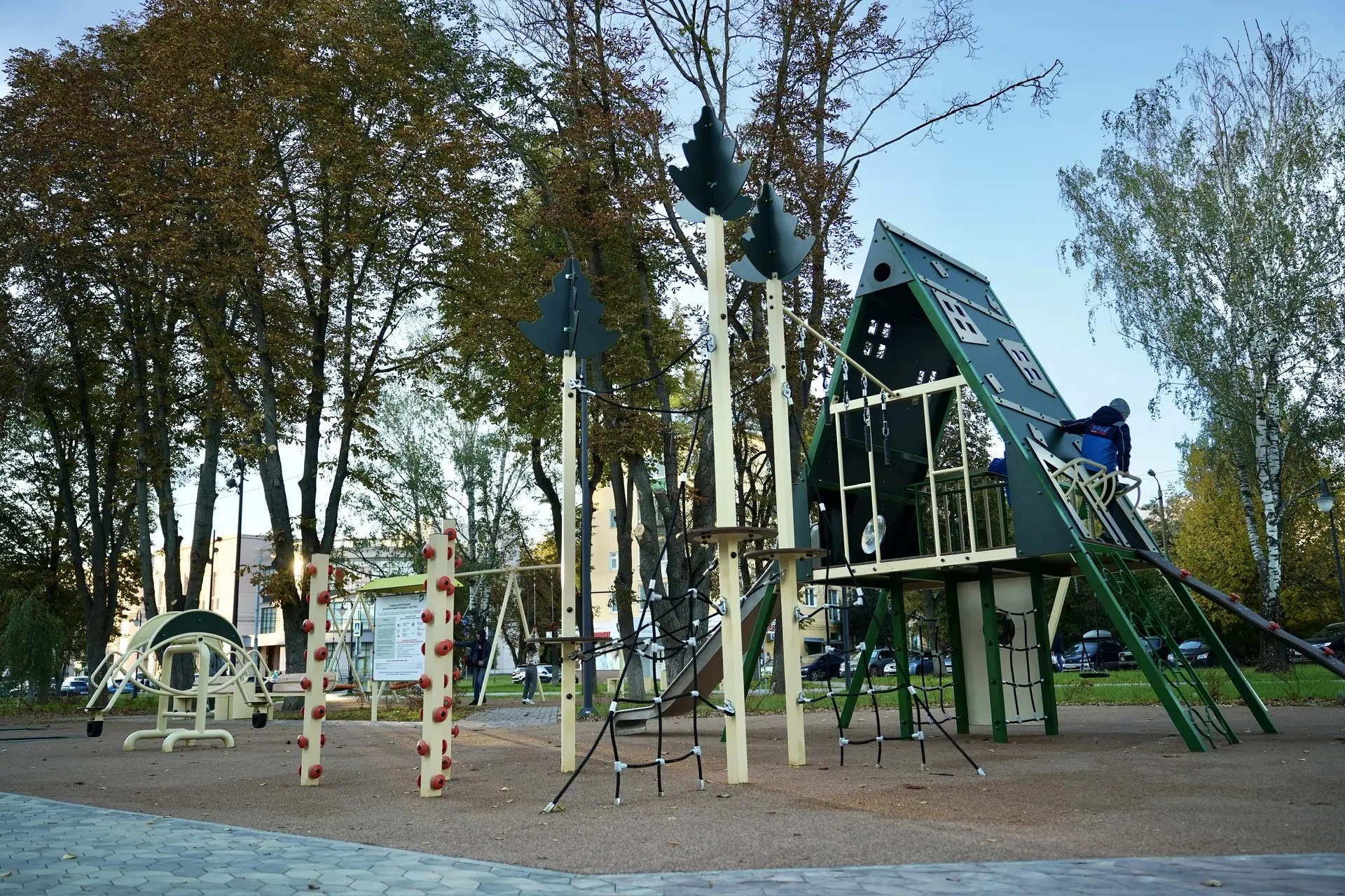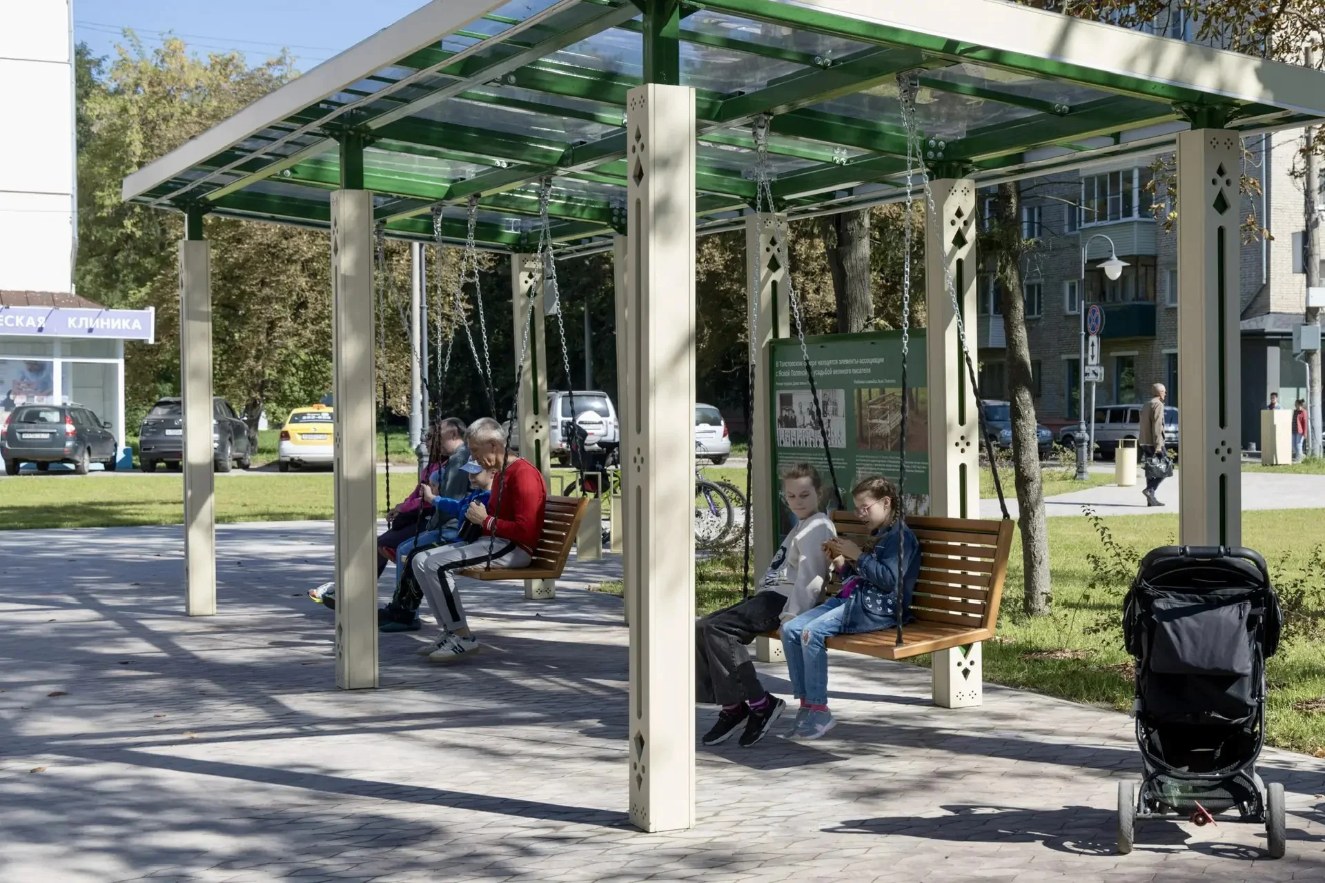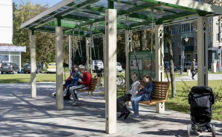 Например, в сквере можно увидеть копию знаменитой березовой скамейки, тематические стенды. Оборудована там и многофункциональная детская площадка. Общая стилистика общественного пространства отражает усадебную тематику.
