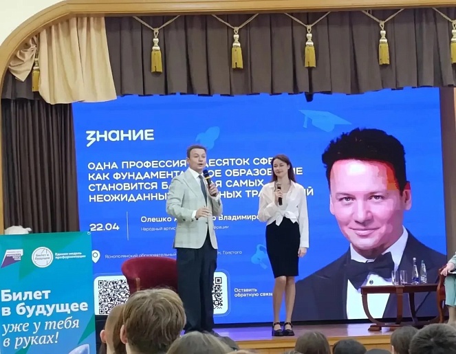 22 апреля по инициативе Российского общества «Знание» в Тульской области прошла встреча школьников с народным артистом России Александром Олешко. Мероприятие состоялось в рамках курса «Россия — мои горизонты». Участие в нем приняли 130 старшеклассников из 7 школ региона.