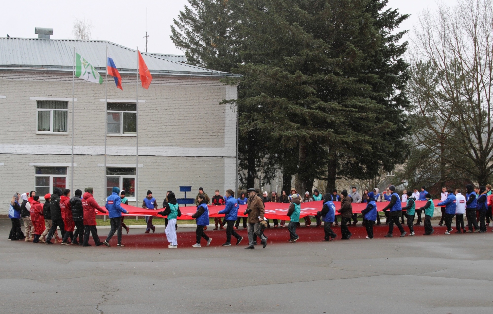 Учащиеся местных школ развернули копию Знамени Победы площадью 200 квадратных метров. Несмотря на снег и сильный ветер, юные патриоты достойно справились с задачей.