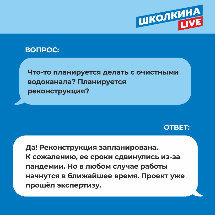 Действительно, пять лет назад Школкина проводила прямой эфир, где отвечала на вопросы жителей Алексина. Один из них касался очистных. На личной странице депутата в соцсетях даже есть карточка с ответом на этот вопрос.