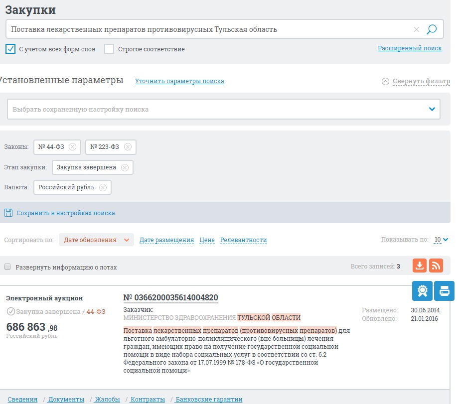 Однако, по данным сайта госзакупок, последний раз минздрав Тульской области осуществлял закупку препаратов в январе 2016 года.