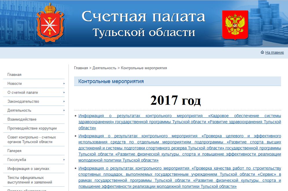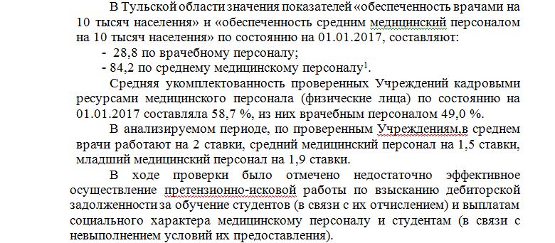 На официальном сайте Счетной палаты Тульской области есть отчет о проведенном с 25 июля по 4 сентября 2017 года контрольном мероприятии «Кадровое обеспечение системы здравоохранения» государственной программы Тульской области «Развитие здравоохранения Тульской области».