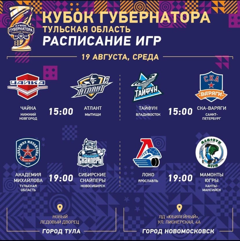 Уже 18 августа стартует Кубок губернатора по хоккею. Основные матчи пройдут в новом Ледовом дворце в Туле, а также в Ледовом дворце «Юбилейный» в Новомосковске. Первые игры состоятся 18, 19 и 20 августа, полуфинальные — 22 августа и финальные — 23 августа. В чемпионате примут участие хоккейные команды из Тулы и Новомосковска.