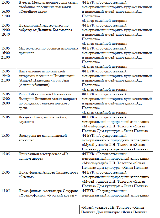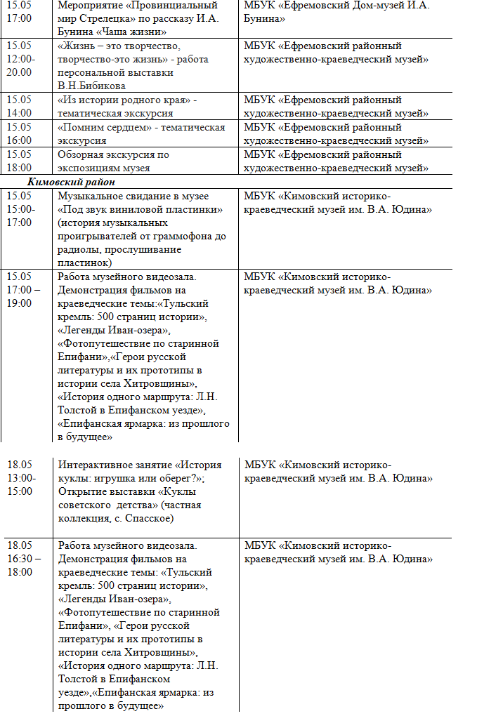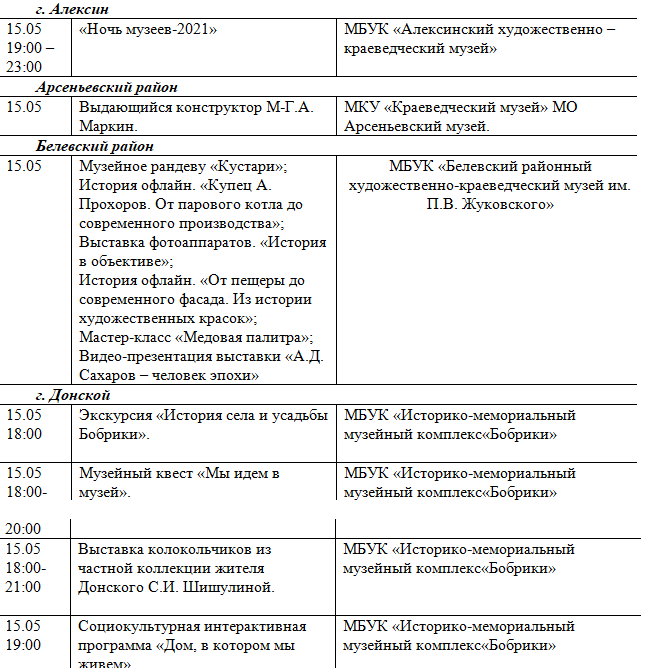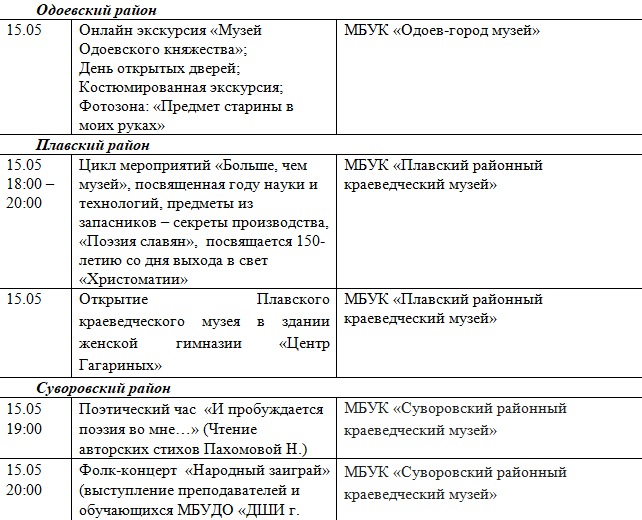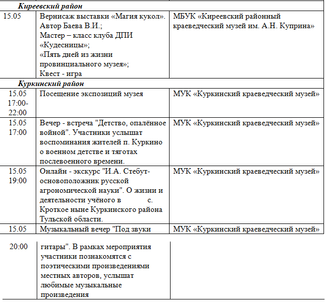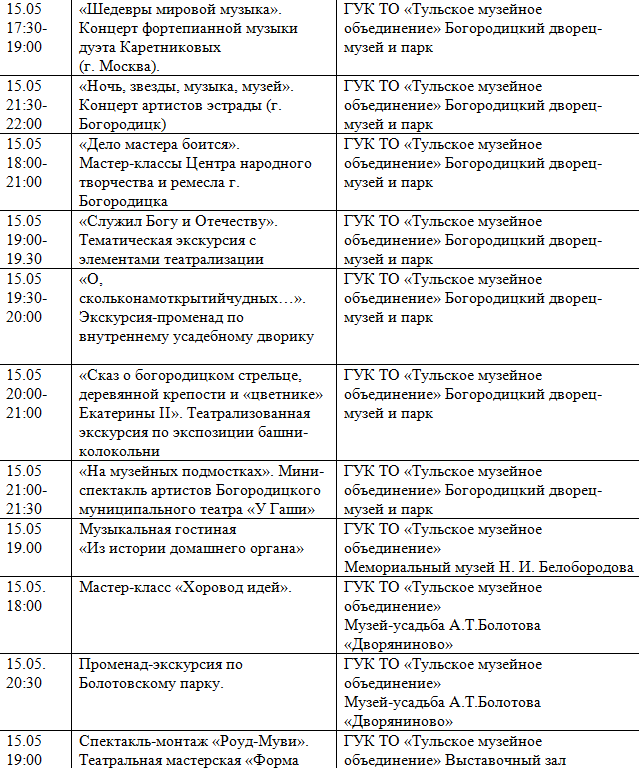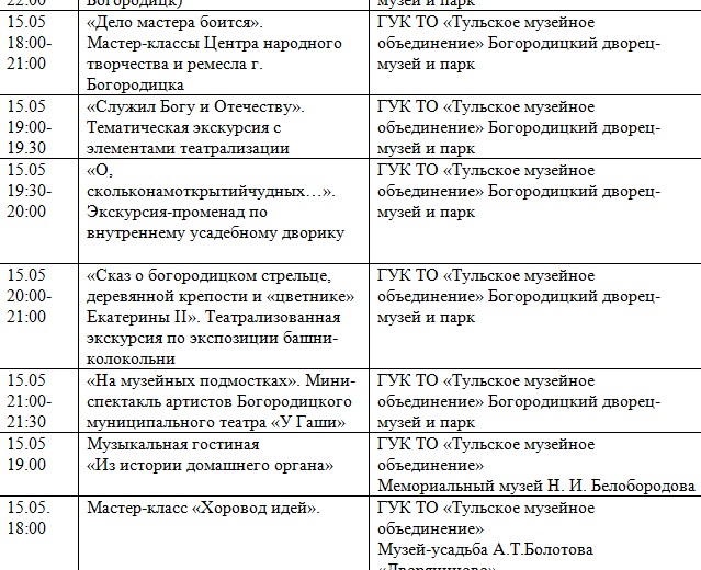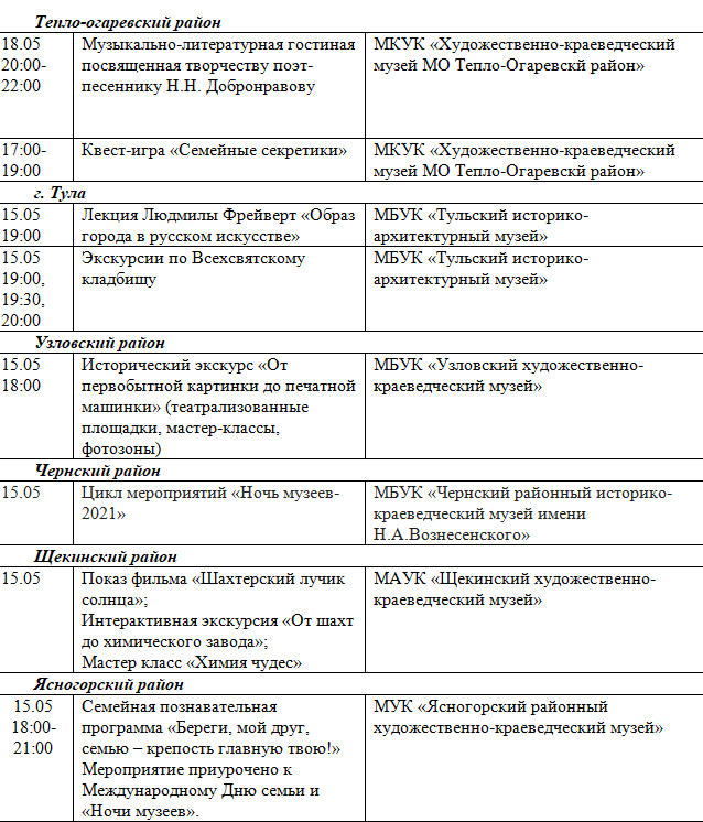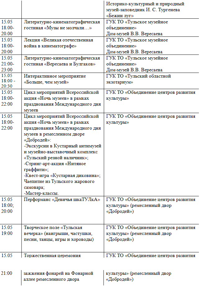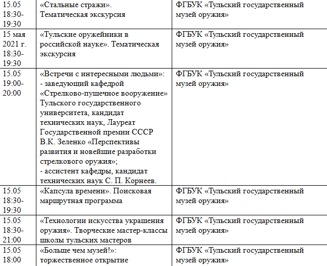 15 мая в Тульской области пройдет всероссийская акция «Ночь музеев». Так, в Тульском областном художественном музее, откроется выставка, посвященная художникам-передвижникам. Творческий индустриальный кластер «Октава» 15 мая будет работать до полуночи. В Музее станка также до полуночи будет открыта выставка художника Андрея Люблинского «Хорошие/плохие». Тульский областной экзотариум приглашает посетителей до 20:30 — в программе тематические интерактивные мероприятия.