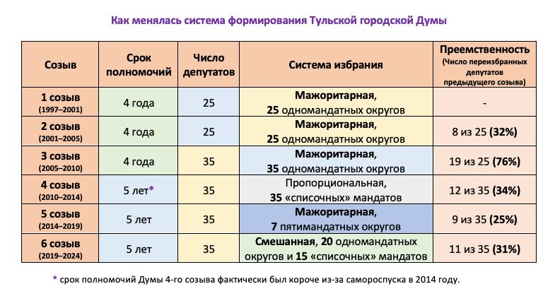 23 ноября 1997 года в Туле появился новый представительный орган местного самоуправления – городская Дума. 24 года назад она состояла из 25 депутатов-одномандатников, и с тех пор каждый созыв избирался по новой системе. К выборам 2019 года пятимандатные округа были ликвидированы, а вместо них введена смешанная система, при которой были и одномандатные округа, и голосование по партийным спискам.