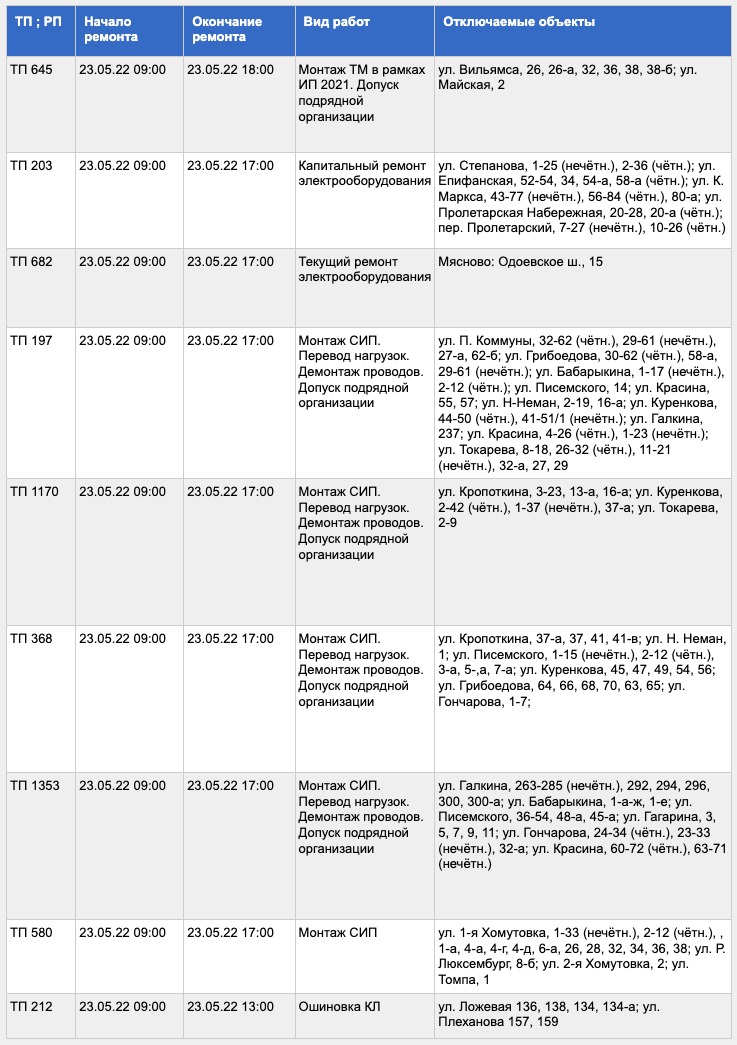 23 мая часть Тулы останется без света. Для планового ремонта электрооборудования, монтажных и других работ, в понедельник в областном центре обесточат дома, в частности, на улицах Вильямса, Майской, Степанова, Епифанской, Карла Маркса, Галкина, Писемского, Коропоткина, Ложевой и Токарева.