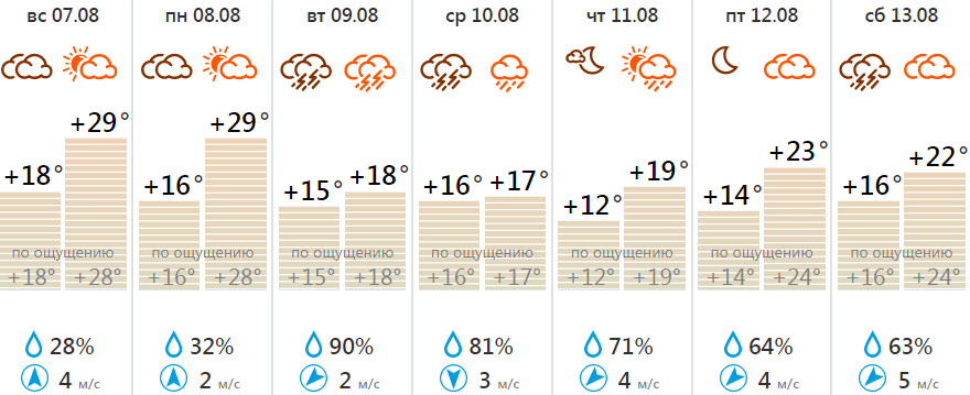 «А в четверг-пятницу очаг высокого давления станет разгонять тучи и вероятность осадков будет небольшой», — сообщают синоптики.