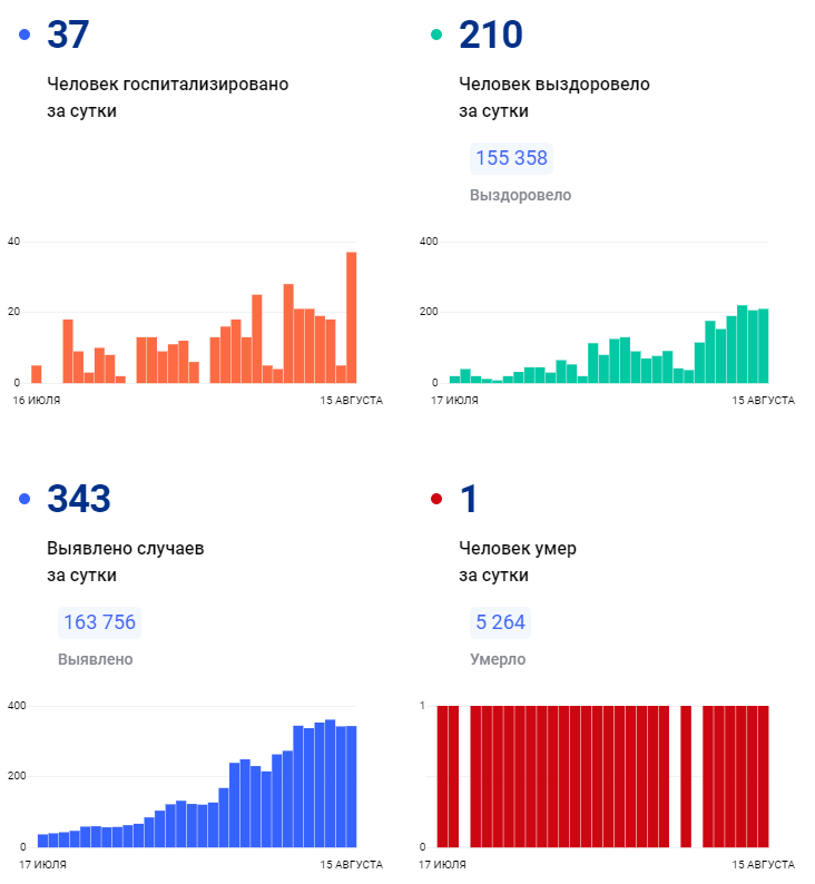 Всего с начала пандемии коронавирусом заболели 163 756 человек, а выздоровели — 155 358. Общее число умерших пациентов к 15 августа достигло 5 264.