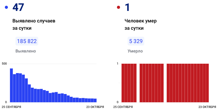 В Тульской области продолжает снижаться заболеваемость COVID-19. За последние сутки в регионе диагностировали 47 случаев коронавируса, одного человека госпитализировали. По данным федерального оперативного штаба на 23 октября, в Тульской области также подтверждена одна смерть среди ранее заболевших коронавирусом, 30 человек прошли лечение и выздоровели.