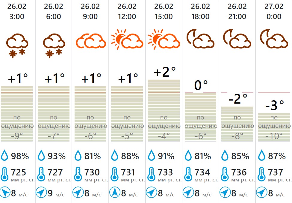 В Туле в воскресенье 26 февраля ожидается пасмурная погода без осадков. Ночью и утром возможен снегопад, однако он прекратится к 9:00. Температура воздуха поднимется до +2 градусов. Влажность — более 90%. Атмосферное давление — от 725 до 736 мм рт. ст. Ветер 8 м/с.