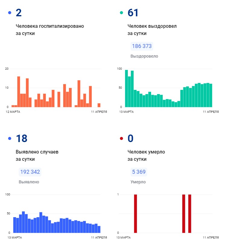 Всего с начала пандемии в регионе заболели 192 342 человека, а выздоровели — 186 373. Общее число умерших туляков за последнюю неделю не изменилось. К 11 апреля оно достигло 5 369.